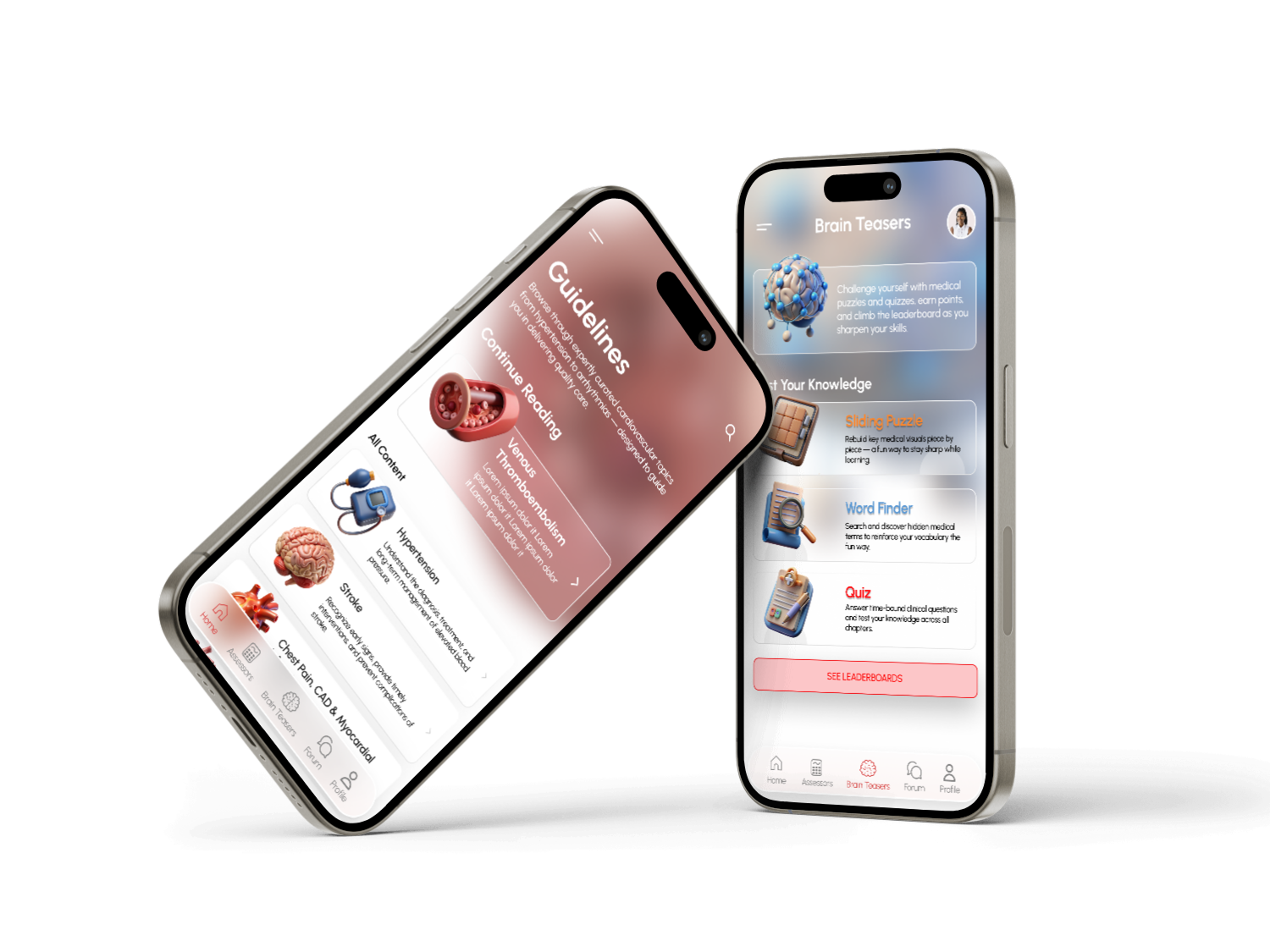 AkomaCare gives healthcare professionals in Ghana instant access to the National Guidelines for the Management of Cardiovascular Diseases, plus tools for self-assessment, gamified learning, and quick reference during patient care.